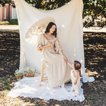A white sheet backdrop, hanging from a gorgeous magnolia tree. Perfect for photos with little ones.